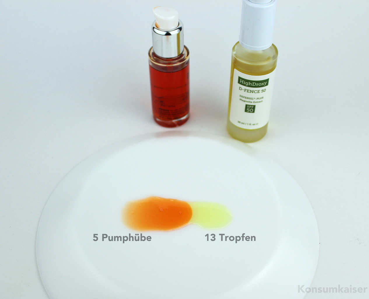HighDroxy empfiehlt 10-12 Tropfen (einen Pumphub der Pipette) für den kompletten UVB Schutz 50, das entspricht einem UVA Schutz von 32. Halbiert man die Menge, erhält man immer noch einen überproportionalen UVB Schutz von 20. Gute Werte!