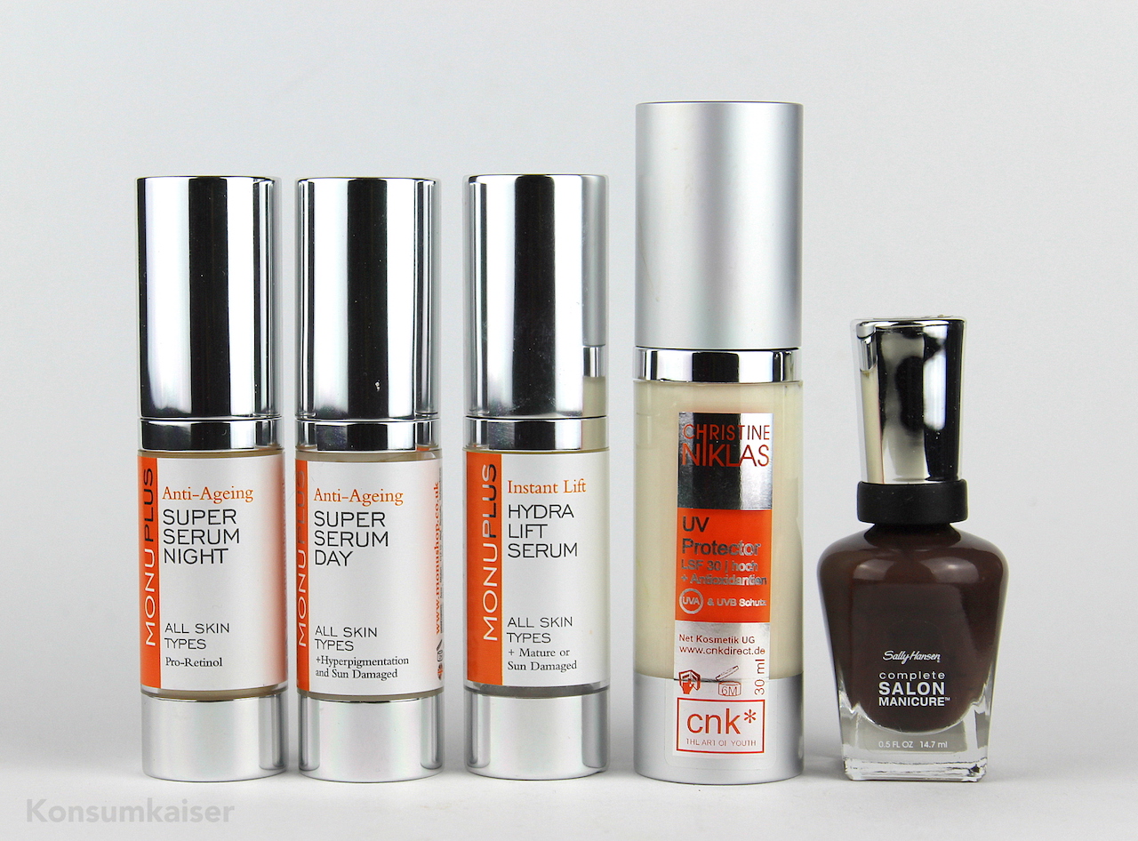 1 x Monu Plus „Super Serum Night (Pro Retinol)“ + „Super Serum Day“ + „Hydra Lift Serum“ + Christine Niklas „UV Protector LSF 30“ + Sally Hansen Nagellack