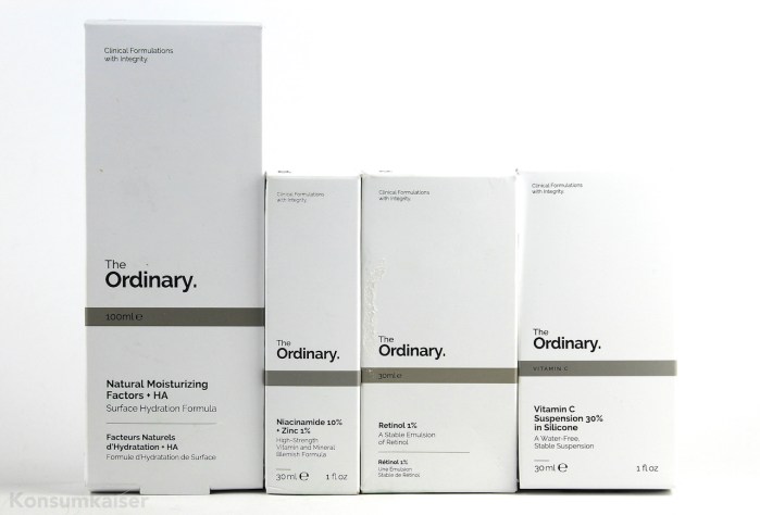 1 x The Ordinary „Natural Moisturizing Factors & HA“ (100ml!) + „Niacinamid 10% & Zink 1%“ + „Retinol 1%“ + „Vitamin C Suspension 30% in Silicone“