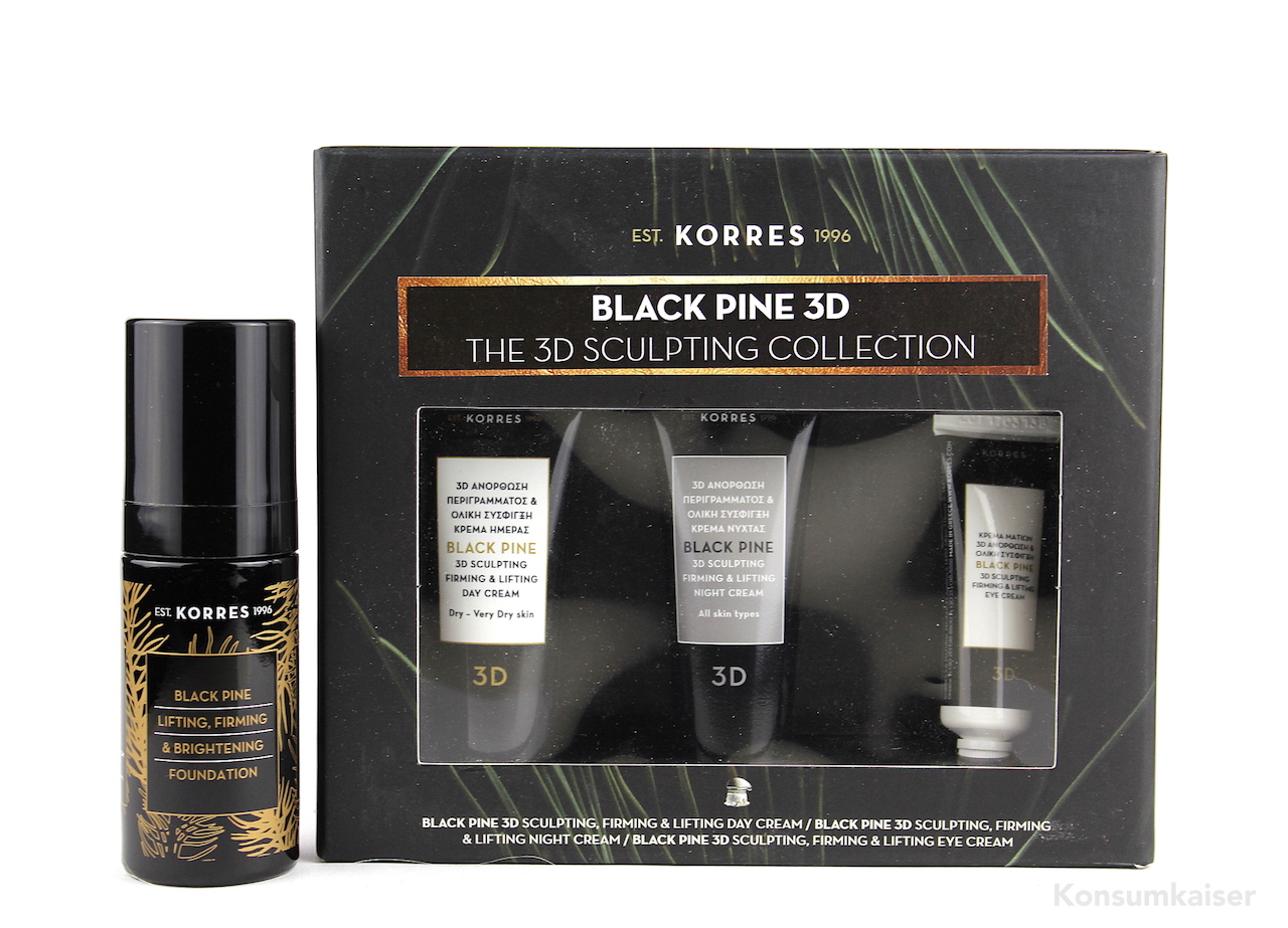 1 x Korres „Black Pine Fifting, Firming and Brightening Foundation“ + „Black Pine 3D Sculpting Collection (Tag, Nacht, Auge)“
