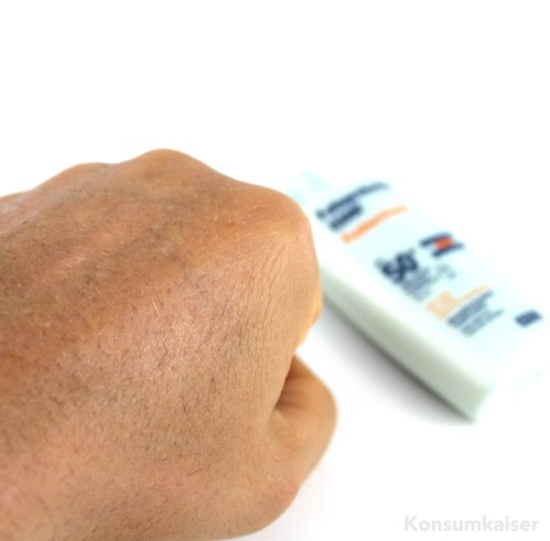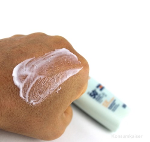 Aber: Es weisselt wirklich nichts! Es ist zwar auch Titandioxid enthalten, aber einmal leicht verrieben bleiben keine sichtbaren Rückstände auf der Haut. Super!