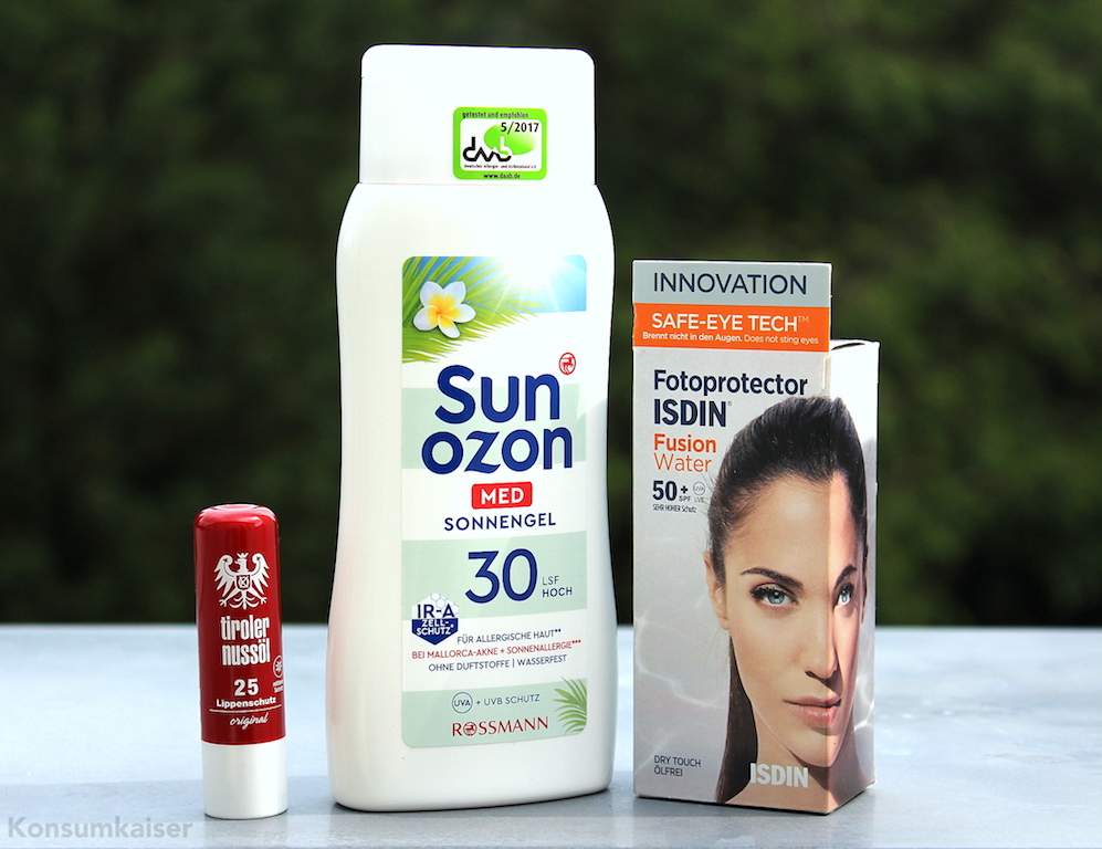 Lange hat es gedauert, aber meine Favoriten in diesem Jahr hinterlassen keine weißen Rückstände, besitzen kein Parfüm oder Alkohol denat., sind recht leicht auf der Haut, pflegen trotzdem, und speziell das Produkt für den Körper ist sehr günstig: Von Rossmann das Sun Ozon Med Sonnengel 30 und von ISDIN das Fusion Water 50+