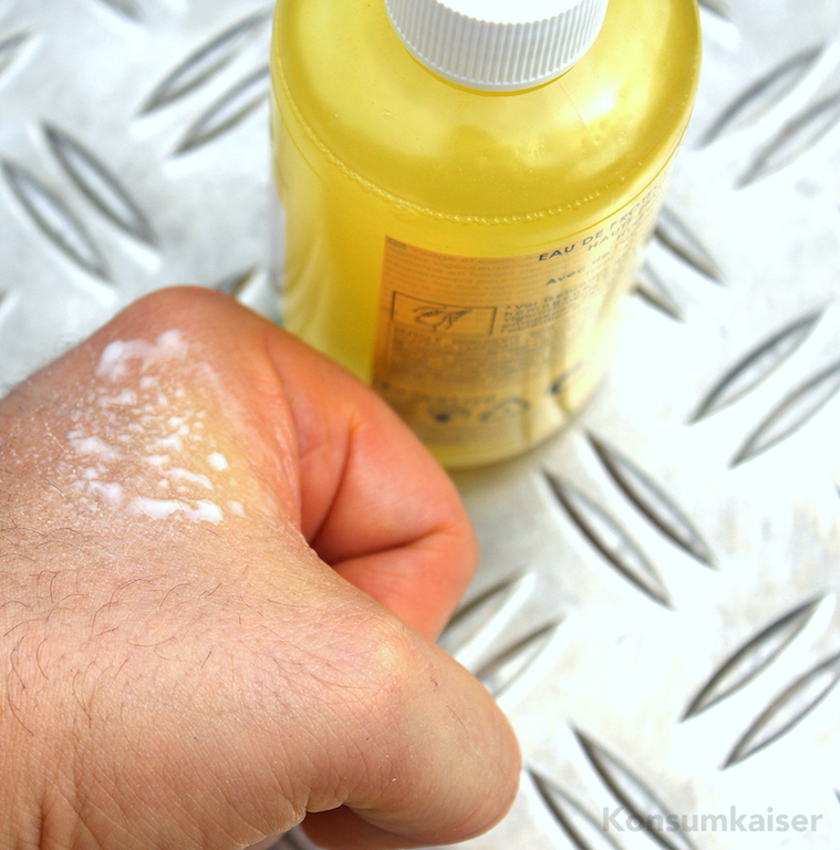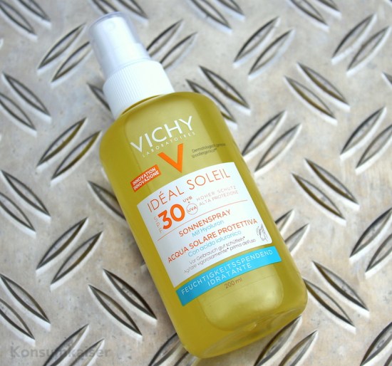 Das Sonnenspray mit Hyaluron SPF 30 von Vichy ist ein 2-Phasenprodukt. Diese müssen vor Gebrauch vermengt werden (gut schütteln!). Für mich überwog der eher klebrige Eindruck, wenn man denn auch richtig (notwendig) große Mengen auf die Körperhaut gesprüht hatte. Erfrischend ist eher der Duft, der zu Anfang etwas prominent hervorsticht.
