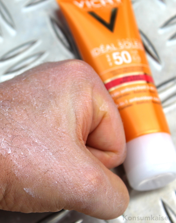 Der 50er antioxidative Gesichtsschutz von Vichy ist eine relativ reichhaltige fluidartige Creme, die sowohl organische als auch mineralische Schutzfilter enthält. Leider weißelt das Produkt deutlich, man muss es sehr lange verreiben, bis die weißen Spuren unsichtbar werden, und es erscheint mir recht schwer auf der Haut. Das ist mir lästig und ich mag zB. auch nicht um die Augenpartie herum so heftig rubbeln müssen!