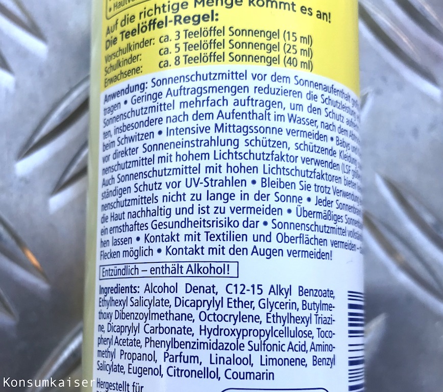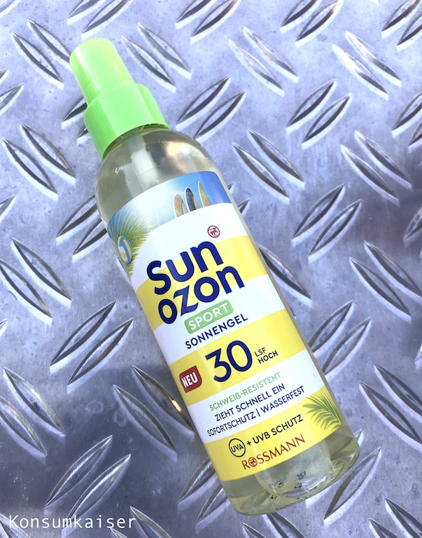Meine Wahl fiel auf Sun Ozon Sport Sonnengel LSF 30 von Rossmann. Ich mag es kaum schreiben, aber hier ist die erste Zutat Alkohol denat. Schlimmer geht es kaum, und auch extra deklarationspflichtige Duftstoffe tummeln sich in diesem Produkt en masse.