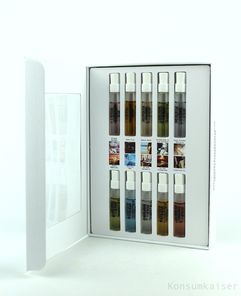 Die Box enthält die folgenden zehn Düfte (je 3,2 ml Eau de Toilette): Lazy Sunday Morning, Jazz Club, Beach Walk, At the Barber’s, By the Fireplace, Lipstick On, Promenade in the Gardens, Flower Market, Sailing Day und Music Festival. Immer nur 2 bis 3 Düfte ausprobieren und danach eine Zeitlang warten, um die Nase nicht zu überfordern.