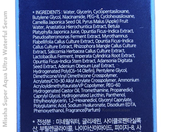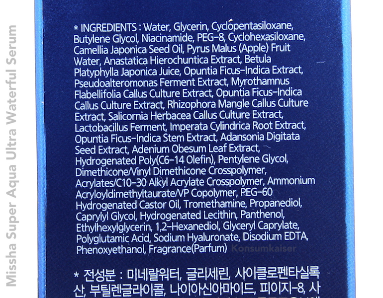 Ich bin beeindruckt von dem wunderschönen Spender, der das Serum auch noch klasse schützt. Das Teil macht sich im Bad wirklich gut, aber das nur am Rande. Wichtig ist ja die Wirkung, und da lässt sich Missha nicht lumpen und setzt eine üppige Inhaltsstoffliste zusammen.