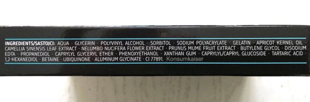 Die Inhaltsstoffliste ist angenehm überschaubar. Feuchtigkeit wird der Haut hauptsächlich durch Glycerin und Sorbitol (Zuckeralkohol) angeboten. Gepflegt wird die Haut mit Aprikosenkernöl, Lotusblütenextrakt, Extrakte aus dem Aprikosenfruchtfleisch. Antioxidantien kommen aus dem Grünteeextrakt und Q10. Etwas Titandioxid schliesst die Formulierung ab.