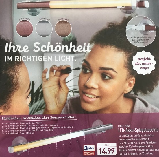 Aldi Nord hat ab nächste Woche Donnerstag (23.08.2018) wieder das einstellbare Schminklicht im Angebot. Viele von euch waren ja begeistert, und ich kann mir lebhaft vorstellen, wie praktisch das auch gerade für unterwegs ist. Unschlagbarer Mehrwert bei Aldi sind die 3(!) Jahre Garantie. Hier der Screenshot der Anzeige: