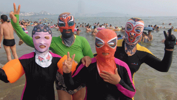 Diese Sonnenschutzmasken werden hier sicherlich unter das Vermummungsverbot fallen. Bei den Bildern davon werde ich immer an nicht so ganz teuer produzierte japanische/asiatische Filme erinnert mit Superhelden, die dann z.B. auf Tele5 laufen. Dann doch lieber den Schirm auf dem Kopf.