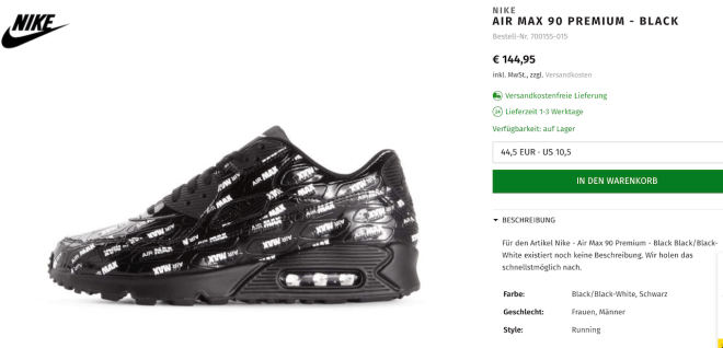 Wenn einem sonst nichts mehr einfällt, dann schreibt man eben irgendwas immer und immer wieder auf den Latschen. Tolles Design, so einfallsreich. Aber wenn es gerade „IN“ ist, was soll man als Sportartikelriese dagegen machen? Sneakershersteller springen derzeit auch auf JEDEN Trend, wie zum Beispiel beim Nike Air Max Premium 90 für ca. € 145,00.