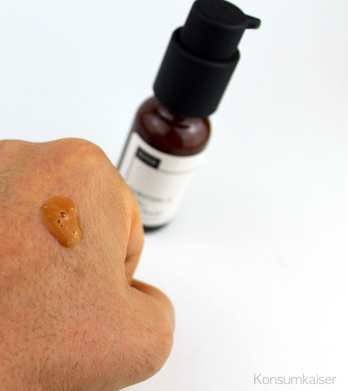 Survival 0 ist milchig-flüssig und hat einen ganz leichten Eigenduft, der mich sehr schwach an Zimt erinnert. Kaum wahrnehmbar, und schnell verflogen, also fast nicht erwähnenswert. Da stimmt mich die braune Färbung der Flüssigkeit schon nachdenklicher, denn man kann sich damit eindeutig helle Kleidung versauen. Die enthaltenen Carotinoide sorgen für die intensive Färbung, die man durchaus auch auf einem weißen Kopfkissen wiederfinden kann. Also Obacht, trotzdem sind die Carotinoide wertvolle und wirksame Wirkstoffe gegen oxidativen Stress.