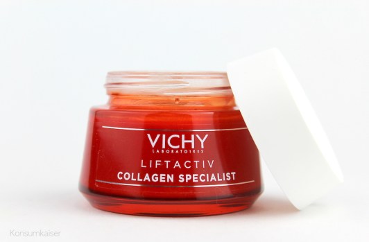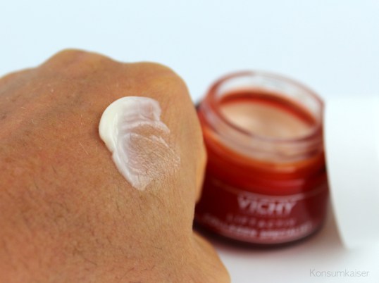 Jetzt aber bitte nicht falsch verstehen: Trotzdem ist der Collagen Specialist von Vichy keine Anti-Aging Pflege, wie wir sie bevorzugen. Es ist eine tolle Creme für den Effekt, für optisch schönere Haut. Auf die Anti-Aging Pflege vertraue ich hier nicht. Eher schon auf die ausreichend gute Feuchtigkeitsversorgung, die man aber mit einem guten Hyaluronserum vor der Creme noch unterstützen sollte!