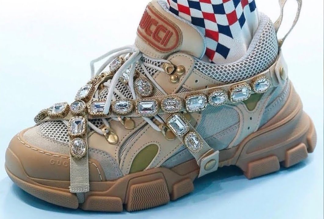 Ja, die klobigen Biester, die aussehen als ermöglichten sie einen Spaziergang am Meeresgrund, ohne wieder zur Oberfläche zu treiben, sind doch immer noch angesagt. Derzeit reizt Gucci die Fashion Crowd mit ständig ausverkauften Tretern, die an Hässlichkeit kaum zu überbieten sind, die aber auch einen Preis aufrufen, von dem eine 4 köpfige Familie einen Monat lang satt werden könnte. Es sind sage und schreibe knapp 1400 US Dollar….Ooops.