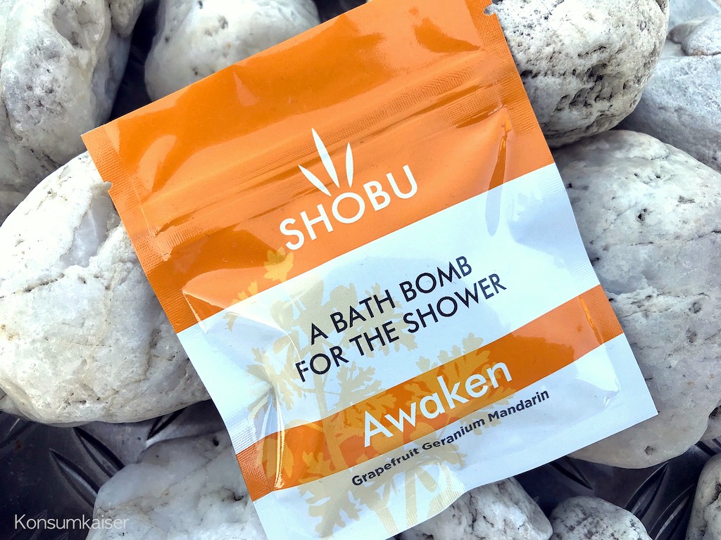 Ab sofort sind Duschbomben angesagt! Allerdings braucht man dazu eine etwas größere „Duschlandschaft. Dann einfach die Shobu Duschbombe auf den nassen Boden werfen (nicht ins fließende Wasser!) und genießen. Mein „Bömbchen“ (Awaken) duftete nach Grapefruit, Mandarine und Geranie. Nicht zu süß, schön erfrischend und belebend! Nice!