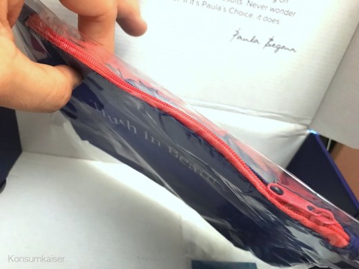 Bei der Bestellung lag noch ein „tolles“ Geschenk bei: Ein „Kosmetiktäschchen“ mit der Paula Aufschrift „Truth in Beauty“ Das dünne Din wage ich gar nicht auszupacken, denn es sieht dermaßen nach Chinaplastik aus, sodass ich die Befürchtung habe, dass bei Berührung eine halbe Chemiefabrik an meine Hände und in die Lungen gerät. Da ist mir gleich klar, warum die das bei PC als „Gift“ (engl. „Geschenk“) bezeichnen. Brrr, sowas kannte ich bislang immer nur von Yves Rocher. Stattdessen sollten PC lieber ein-zwei Proben mehr dazu legen!