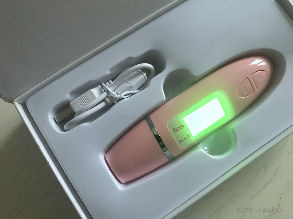 Jedenfalls kam der Skin Analyzer gestern an, sieht erwartungsgemäß etwas schwülstig aus, aber Hey: Augen zu und die Kontakte auf die Backe! Erstes Ergebnis: Gute Werte und ein lachender Smiley. Yeah! Meine Haut scheint gut gepflegt zu werden, welch Überraschung. Demnächst ein ausführlicher Bericht, inklusive Erklärung und Anleitung, die beigelegte kann man übrigens vergessen. Die hat wohl jemand im Reisschnaps-Rausch verfasst…
