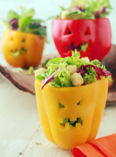 Warum immer nur Kürbis? Eine Paprikaschote kann man auch kinderleicht zum bösen Kürbis schnitzen. Einfach mit dem Messer ziemlich eckige Augen und Mund ritzen und mit leckerem Salat und Croutons füllen.