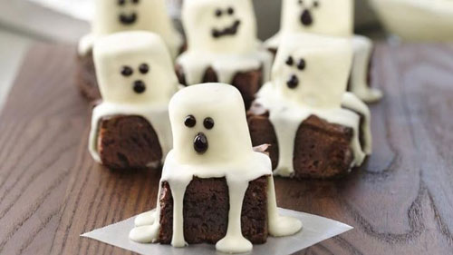 Diese putzigen Poltergeister sind aber nichts anderes als ein Stückchen Brownie, auf das man einen Marshmallow setzt. Dann mit Zuckerguss übergießen und mit geschmolzener Schoki Augen und einen O-Mund malen. Das hat insgesamt sicherlich 666 Kalorien…