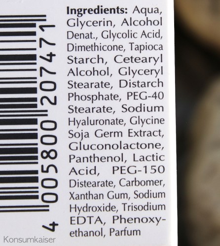 Auch bei diesem Produkt findet sich der ungute Alkohol an dritter Stelle der Inhaltsstoffliste, nach dem Feuchtigkeitsspender Glycerin. Somit ist der Alkoholgehalt garantiert unter 10%, trotzdem spürt man es schon. Allerdings wird die Formulierung dadurch auch elegant und für die Anwendung schön geschmeidig und luxuriös, wenn ich das mal so ausdrücken soll. Alkohol dient auch als Penetrationsverstärker, was aber eben nicht darüber hinwegtäuschen darf, dass er zu den umstrittenen Wirkstoffen zählt, ganz im Gegenteil.