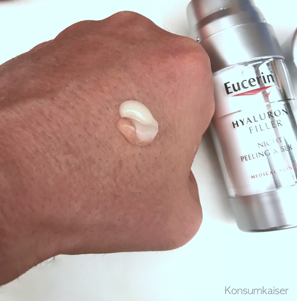„Die Gesamtkonzentration an Glykolsäure und Polyhydroxysäure im Eucerin Hyaluron-Filler Nacht-Peeling & Serum beträgt knapp 10 Prozent. Der pH-Wert des Produktes, wenn beide Kammern kombiniert werden, liegt bei 3,7.“