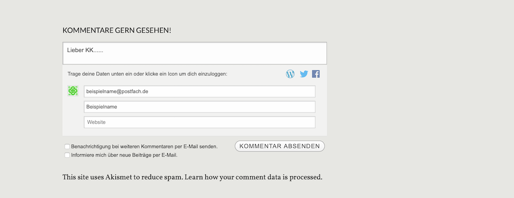 - Kreuzt man die beiden unteren Kästchen noch vorher an, erhält man eine Benachrichtigung per e-Mail, wenn es weitere Kommentare zum Thema gibt (1. Kästchen) und/oder ein neuer KK Blogbeitrag online geht (2. Kästchen).