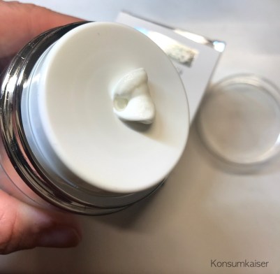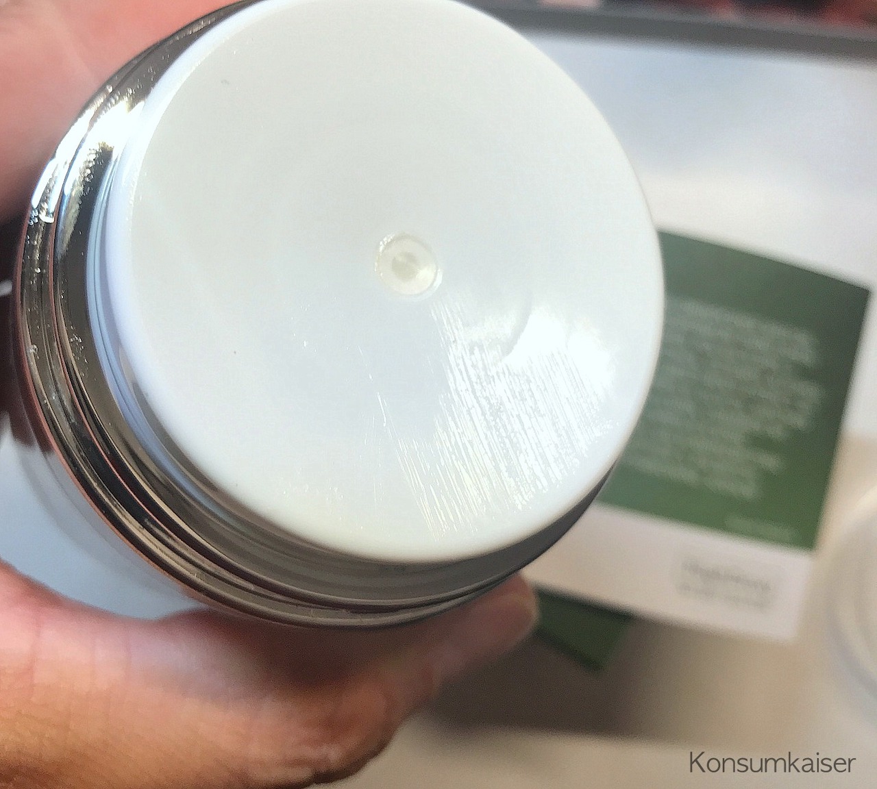 Was ich nicht so mag, ist der Drucktiegel, obwohl es ein Airlessspendersystem für Cremes ist. Dickflüssigere Produkte kommen oftmals nicht mit Spendern zurecht, und ein offener Tiegel wäre indiskutabel. Bei dieser Lösung hier, muss man aber auch auf die Hygiene achten, denn ein leichter Cremefilm bleibt auf der Oberfläche der Trennscheibe zurück. Ich wische nach jeder Benutzung mit einem Tuch nach. Muss man nicht, fühlt sich aber besser an und sieht sauberer aus!