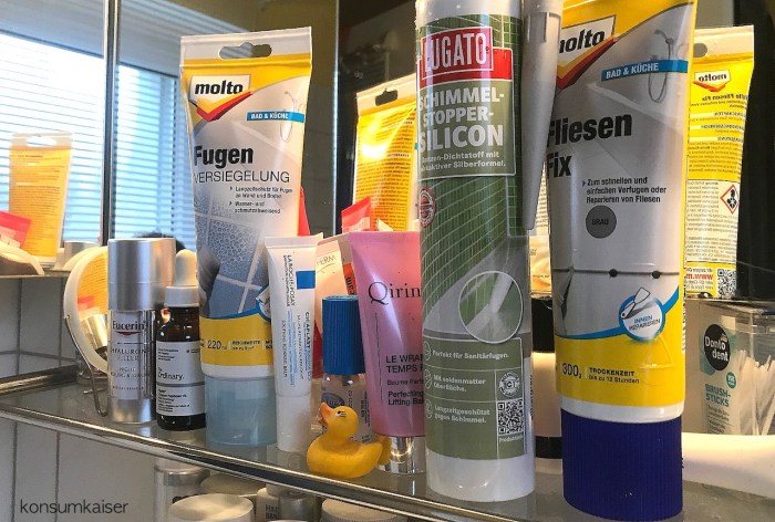 Neulich morgens in meinem Bad. Verschlafen laufe ich zum Spiegel und schaue unbeteiligt auf meine Pflegeprodukte, die auf dem Regal vor mir stehen. Nun zum Suchbild: Finde die etwas unpassenden „Pflegeprodukte“…oder sollte man ihnen mal eine Chance geben?