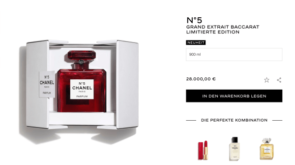 Man findet das Eau de Parfum im roten Glasflakon, genauso wie das intensive Parfum, sowie das frischere und leichtere N° 5 L´EAU. Der exklusive, 900ml fassende kostbare N°5 rote Kristallflakon entstand in enger Zusammenarbeit von Chanel mit Kunsthandwerkern wie Glasbläser, Glasschleifer, Graveure und Vergolder von Baccarat, und kostet geschmeidige 28.000 Euro. Schreibt schon mal eure Wunschzettel!