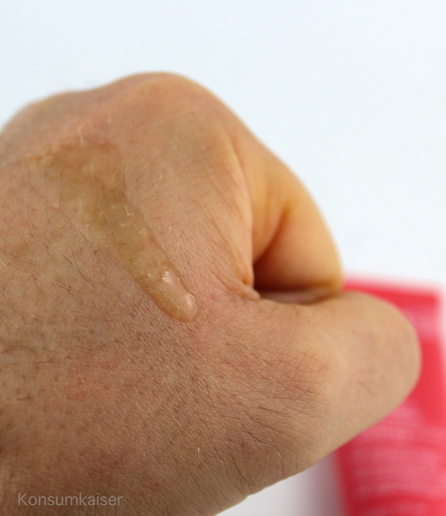 Anmutung: Ein fast klares und sehr dünnflüssiges Serum, das schnell mal aus der Hand läuft und in einer Plastiktube daherkommt, die nur den Inhalt gut vor Luft schützt, wenn man den speziellen Tubenmechanismus auch korrekt verwendet. Man stellt die Tube besser nur auf den Kopf, damit dürfte es Sauerstoff etwas schwerer haben in die Tube zu dringen. Bei Gebrauch etwas Serum in das transparente Reservoir in der Spitzenmitte drücken und dann weiter drücken und in die Hand tropfen lassen. Die Tube nicht loslassen und sofort verschliessen! Viel Aufwand, ein Spender wäre natürlich einfacher (und teurer) gewesen. PC erklären die korrekte Anwendung ihren „Neulingen“ übrigens nicht, und diese werden unwissend wohl ordentlich viel Luft in die Tube zurückpumpen.