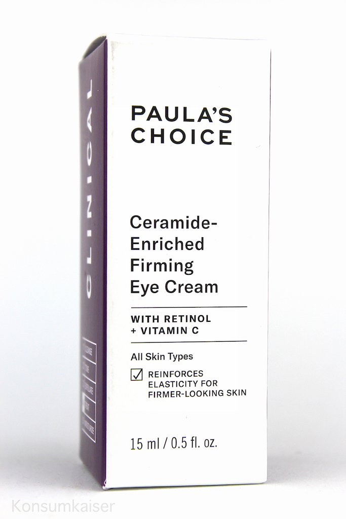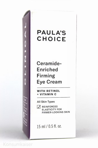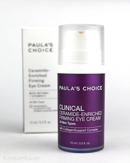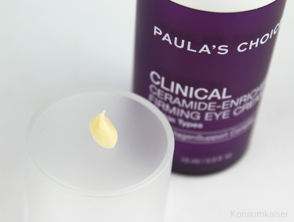 Die „Clinical Ceramide-Enriched Firming Eye Cream“ kommt wie ihre Gesichtspflegeschwester auch in einem lilafarbenen Pumpspender daher, der aber deutlich kleiner ist, und den Inhalt sehr sauber und akkurat dosiert. Vorsichtig drücken, man braucht wirklich nur eine kleine Menge.