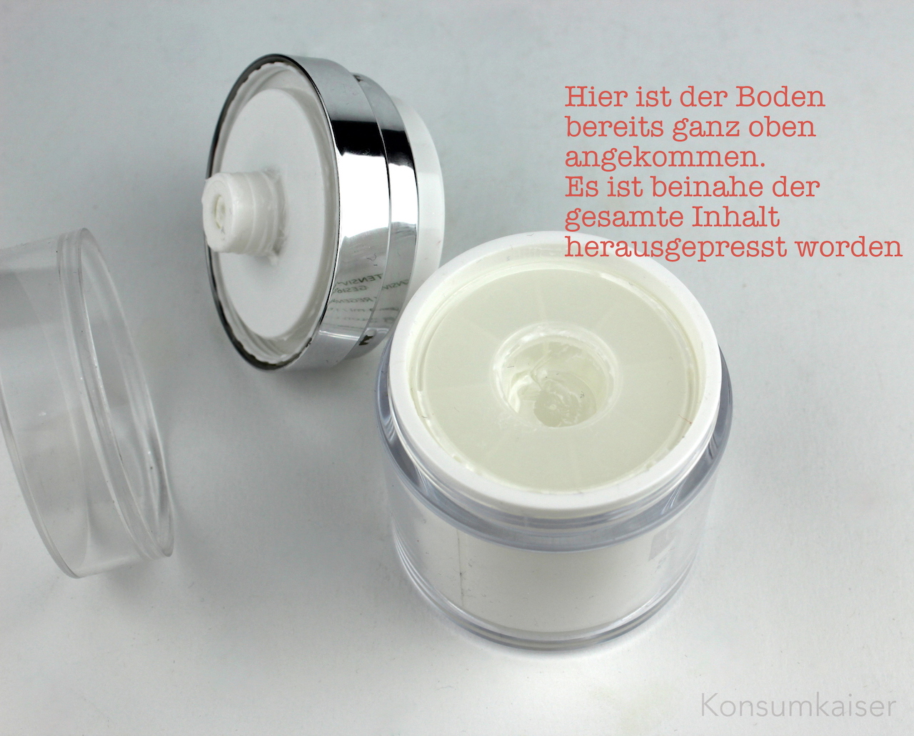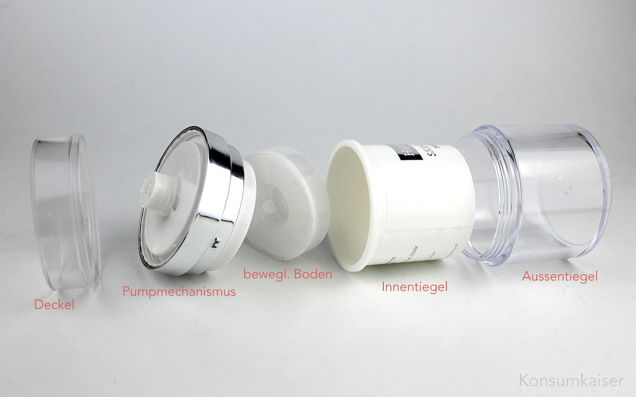 Eng ineinander geschobene Plastikkontainer und ein aufgesetzter Pumpmechanismus lassen den inneren Containerboden durch Unterdruck nach oben kommen. Dabei wird nur die Creme herausgepresst, Luft kann nicht eindringen, weil gar kein Platz dafür da wäre.