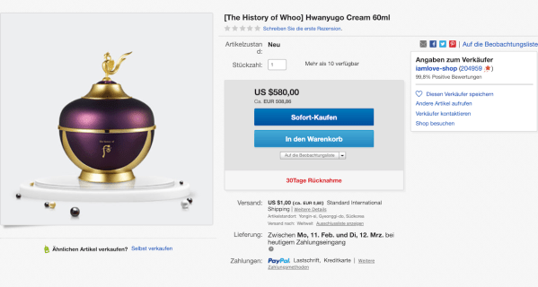 60 ml der „Hwanyugo Cream“ von The History Of Whoo kostet doch tatsächlich ca. 580 US Dollar. Wow, welcher (faule) asiatische Zauber da wohl drin ist? Bitte nicht anfragen, ich teste das Zeugs nicht! Never! Niemals! 😉