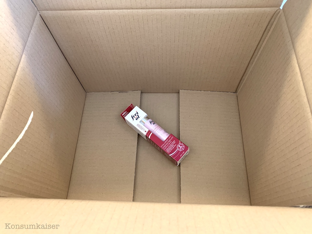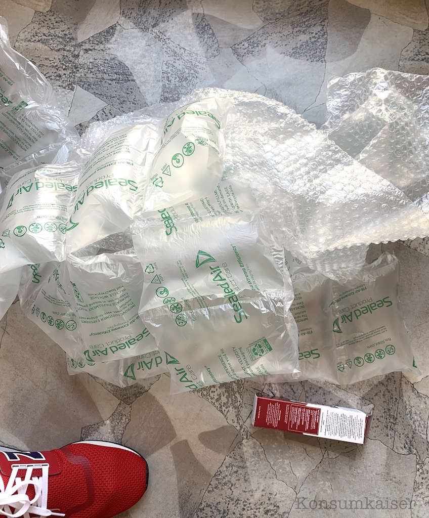Das Rätsels Lösung: Es war auch nur das Hyaluronserum drin…und jede Menge Plastikpolsterstoff. Der Karton war so dickwandig und stabil, den hätte man problemlos für die nächsten fünf Umzüge verwenden können, ich konnte ihn kaum klein zusammenlegen und zum Papiercontainer zu bringen.