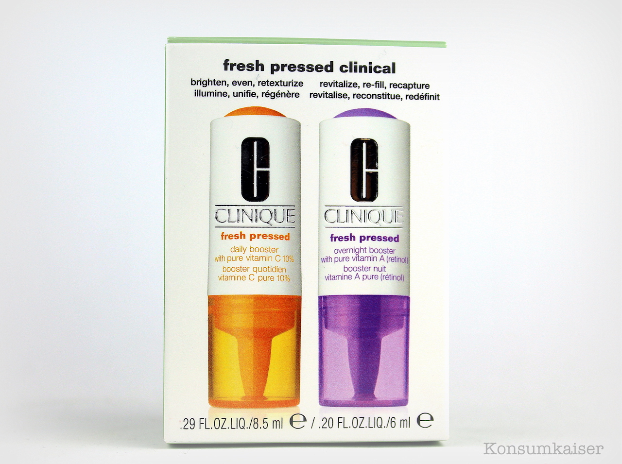 Bisher gibt es das Retinolserum nur in einer Kombipackung mit dem Fresh Pressed Vitamin C, das wir ja bereits kennen, und das nicht das schlechteste Clinique-Produkt ist. Ich bin aber mal gespannt, wann das Retinol auch einzeln zu kaufen sein wird, denn preislich ist die Kombipackung nicht sonderlich attraktiv! ( Clinique Fresh Pressed Booster & Overnight Booster with pure Vitamin A (Retinol) – Kombi 1 x 8,6ml & 1 x 6ml ca. € 34,95 über lookfantastic)