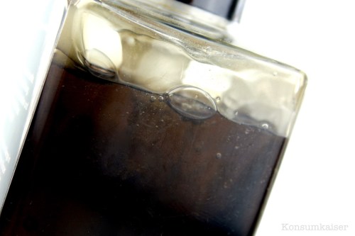 Die enthaltenen Tenside sind demzufolge auch so und so: Ammonium Lauryl Sulfate gilt als recht aggressiv, Sodium Lauroamphoacetate dagegen als milde Waschsubstanz. Bambuskohlepulver (gibt die schwarze Farbe) wirkt hautklärend und saugt überschüssiges Hautfett und kleinere Verunreinigungen auf. Etwas Glycerin wirkt rückfettend. Was der Bambusessig so bei mir bewirkt kann ich nicht sagen, dazu fehlt mir die Erfahrung, denn nach einmaliger Anwendung steht die sehr hübsche Flasche nun nur noch zu Dekorationszwecken im Bad und wird nicht mehr eingesetzt. Ein „Schaschlikspieß mit Essigsoße“ unter der Dusche ist für meine Zitrusfrucht-verliebte Nase keine Alternative. Wer aber etwas total anderes sucht, sollte mal zur Probe schnuppern. Dann aber besser nicht täglich anwenden, denn die Reinigung ist etwas austrocknend.