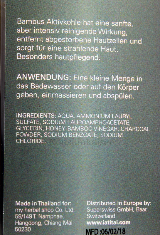 Die enthaltenen Tenside sind demzufolge auch so und so: Ammonium Lauryl Sulfate gilt als recht aggressiv, Sodium Lauroamphoacetate dagegen als milde Waschsubstanz. Bambuskohlepulver (gibt die schwarze Farbe) wirkt hautklärend und saugt überschüssiges Hautfett und kleinere Verunreinigungen auf. Etwas Glycerin wirkt rückfettend. Was der Bambusessig so bei mir bewirkt kann ich nicht sagen, dazu fehlt mir die Erfahrung, denn nach einmaliger Anwendung steht die sehr hübsche Flasche nun nur noch zu Dekorationszwecken im Bad und wird nicht mehr eingesetzt. Ein „Schaschlikspieß mit Essigsoße“ unter der Dusche ist für meine Zitrusfrucht-verliebte Nase keine Alternative. Wer aber etwas total anderes sucht, sollte mal zur Probe schnuppern. Dann aber besser nicht täglich anwenden, denn die Reinigung ist etwas austrocknend.