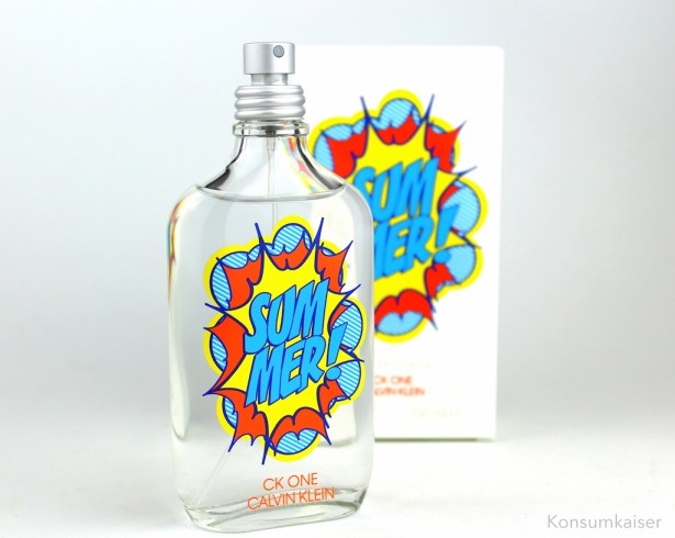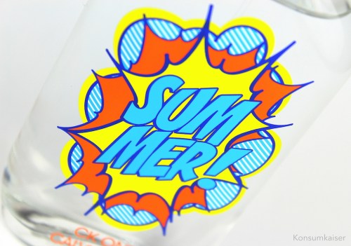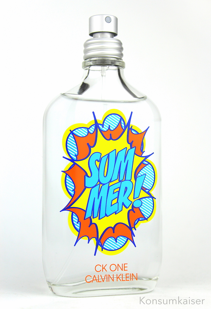 CK Summer 2019 kommt in der altbekannten, aber diesmal klaren Glasflasche, mit ebenso klarem Inhalt. Auf der Flasche prangt dann allerdings ein bunter Sticker im Pop-Art-Siebdruckdesign, der uns mit dem Wort „Summer!“ ordentlich anschreit.
