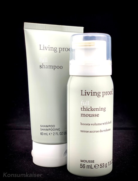 Nun hört man von der US Firma Living Proof ja fast nur unheimlich tolle Erfahrungsberichte, die scheinen da allerdings auch ein enges Netz von Influencern und anderen gesponserten Personen zu haben, die bevorzugt in Hollywood rekrutiert werden. Hat gewirkt, denn spätestens als hier auf dem Blog die Marke in diesem Zusammenhang einmal erwähnt wurde, war meine Neugierde geweckt. Shampoo und Haarschaum in Probiergrößen habe ich mir bei Parfumdreams gekauft, und dann wartete ich auf den Fülleshock auf meinem Kopf.