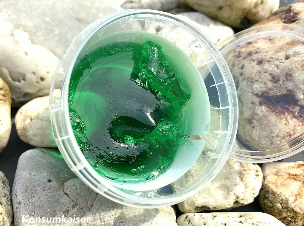 Da man das Jellyzeugs laut Hersteller auch mit einem Duschschwamm nutzen soll, oder eben als ganzes Stück, möchte ich hier nicht weiter herummeckern, meine Anwendung war sicherlich nicht 100% korrekt, aber wahrscheinlich werden 95% der VerwenderInnen es genau wie ich ausprobieren…und scheitern.