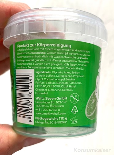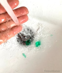 Als ich eine gewisse Menge aus dem Topf gegrabscht hatte, versuchte ich nahezu vergeblich die grünen Bröckchen aufzuschäumen und auf dem Körper zu verteilen. Pustekuchen. Wie gesagt, die grünen Wabbeldinger lagen im Ausguss, ich hatte ein bis zwei zarte Schaumbläschen an der Hand, der Körper wartete vergeblich auf die Einseifung. Ja, „nutzlos“, der erste Gedanke ist immer richtig!