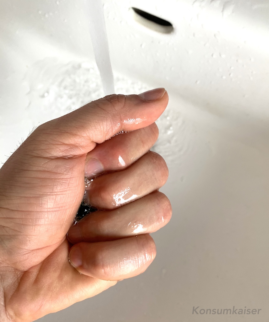 Im Waschlappen oder Schwamm verwenden schloss sich ebenfalls aus, ich verwende sowas prinzipiell nicht. Mit meinen Händen kann ich prima einschäumen, rubbeln und abwaschen. Dachte ich…
