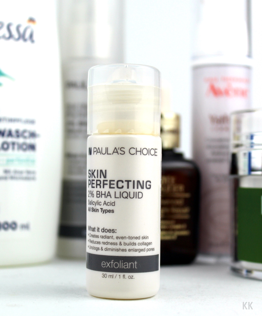 Dazu verwende ich schon lange ein paar Tropfen vom höchst ergiebigen 2% BHA Liquid von Paulas Choice (die Minigröße reicht bei mir zu diesem Zweck monatelang, 30ml, ca. € 11,00). Der pH-Wert des Produktes ist recht niedrig und senkt so den Haut pH ein klein wenig, sodass ich das Gefühl habe, dass folgende Säureprodukte intensiver wirken.
