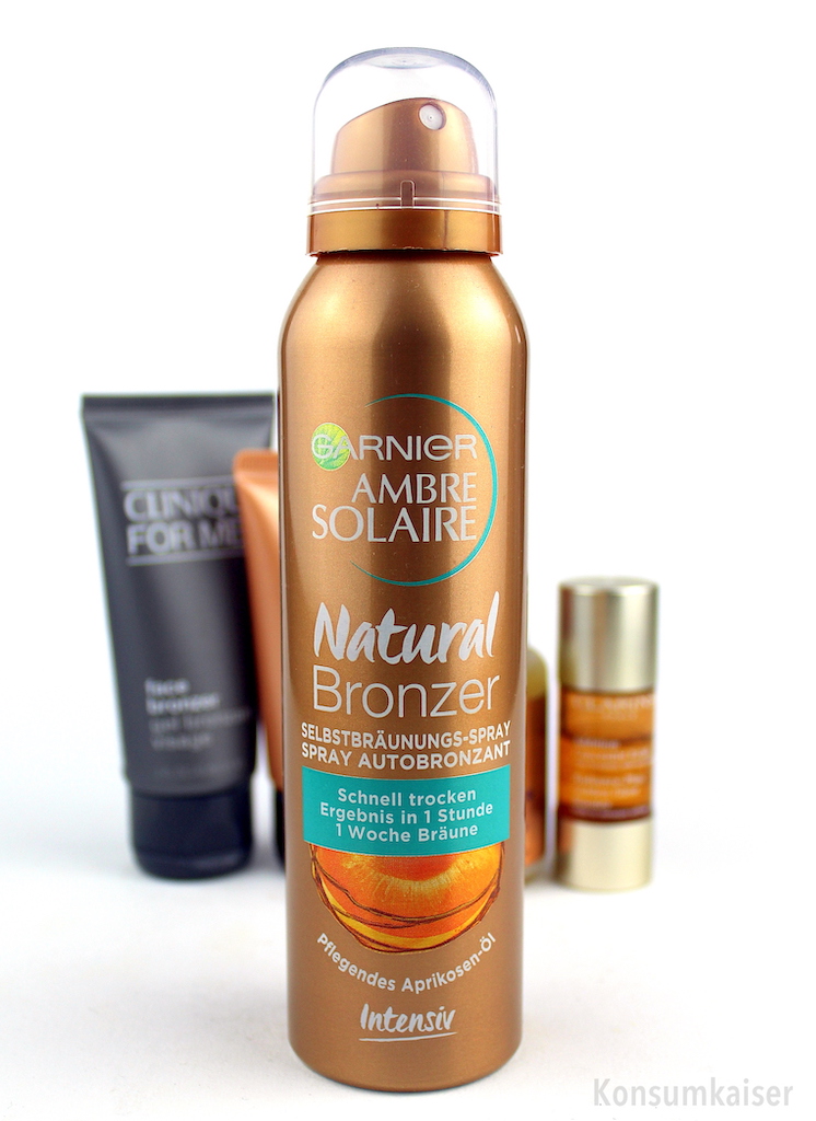 Garnier Ambre Solaire Natural Bronzer Spray (150 ml, ca. € 6,95, Drogeriemarkt/Kaufhaus) Das farblose, transparente Spray ist perfekt für den gesamten Körper, und auch den Rücken kann man damit ganz einfach alleine erreichen. Es verteilt sich fein und gezielt, trotzdem geht eine gewisse Menge immer daneben. Nach dem Sprühen mit den Händen verreiben! Ich würde auch dringend bei der Verwendung lüften, denn man muss das Zeugs nicht unbedingt in Mengen einatmen.