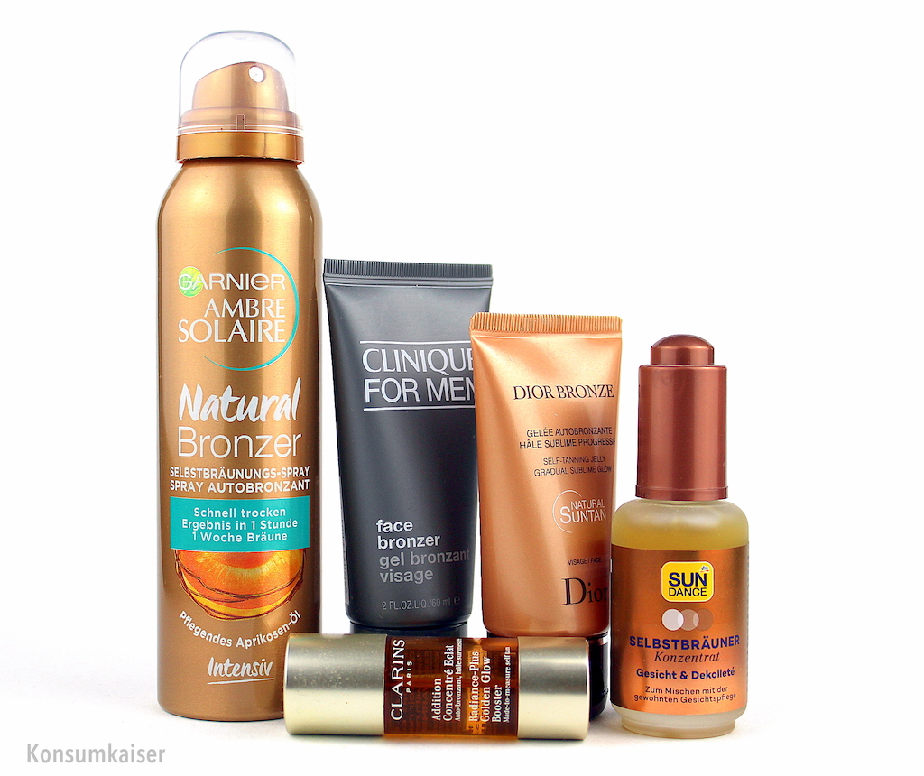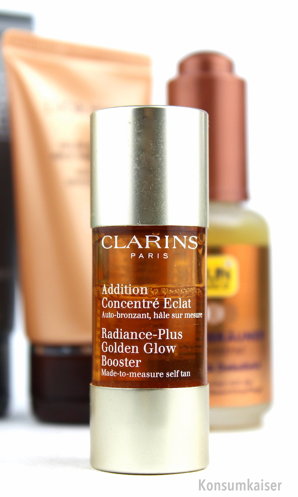 Clarins Addition Concentré Eclat Auto-bronzant (15 ml, ab ca. € 20,00) Ultrapraktisch, da man nur ein paar Tropfen in die gewohnte Pflegecreme mischt. Duft ok, Konsistenz klar und flüssig, Ergebnis selbst steuerbar, je nachdem wie viele Tropfen man verwendet. Bei mir kommt die Bräune erst nach ca. drei Anwendungen gut zur Geltung, hält dann aber auch satte vier Tage (färbt mit DHA und Erythrulose). Sparfüchse können meiner Ansicht nach auch das Produkt für den Körper verwenden, das die identischen Inhaltsstoffe aufweist, allerdings eine deutlich größere Füllmenge besitzt. Unterschiede im Ergebnis konnte ich nicht ausmachen. Enthält Alkohol denat.