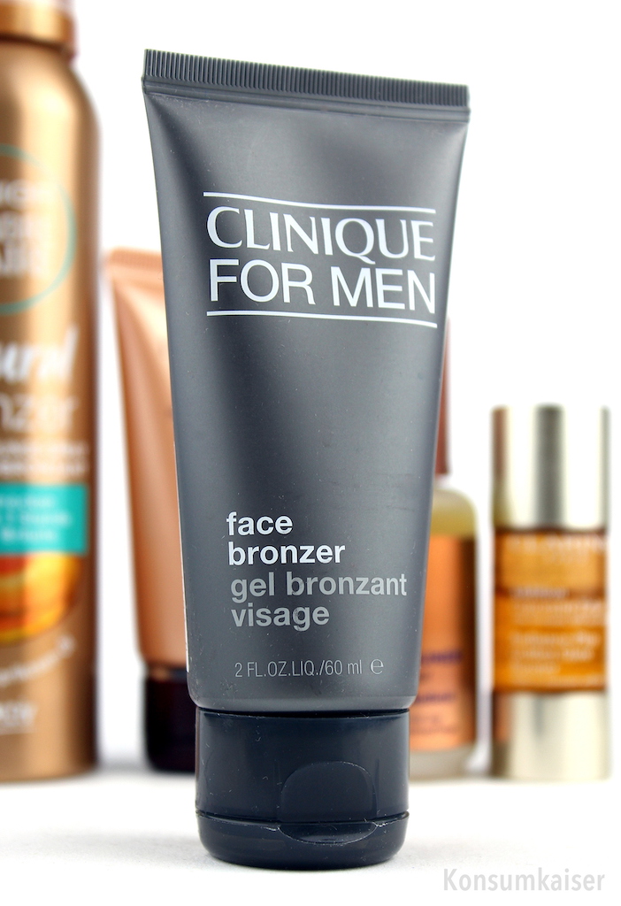 Clinique For Men Face Bronzer (60 ml, ca. € 29,00) Das Gel ist ordentlich dunkel getönt, man bekommt schon zuerst einen Schreck. Dabei ist es aber transparent und einmal auf der Haut verteilt, bleibt nur noch ein wunderbar natürlicher Braunton, den man nicht als Schicht wahrnimmt, weil er mit der Haut verschmilzt. Ein eigentlicher Selbstbräuner ist nicht enthalten, die Tönung kann man mit Wasser und Waschgel wieder abwaschen. Angst vor Regen und Schweiß braucht man nicht zu haben, es bleibt drauf!