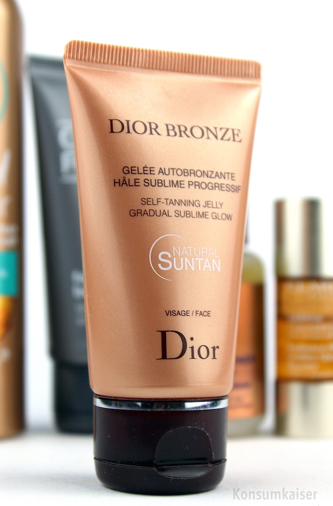 Dior Bronze Self Tanning Jelly Face (50 ml, ca. € 38,00) Es ist zwar ein pfirsichfarbenes Gel, tönt aber weder die Haut, noch ist es zu wenig reichhaltig. Man bekommt eine gehörige Portion Pflege und erst nach ca. drei Stunden einen sehr natürlichen Hauch von Bräune ins Gesicht. Verwendet man das Produkt ein paar Tage lang täglich, kann man die Intensität der Farbe aufbauen (färbt mit DHA only). Nach ca. vier Tagen ist dann der Zauber wieder vorbei. Erwähnenswert ist der ansprechende Duft, der ziemlich ungewöhnlich für mich nach Zimt duftet. Enthält Alkohol.