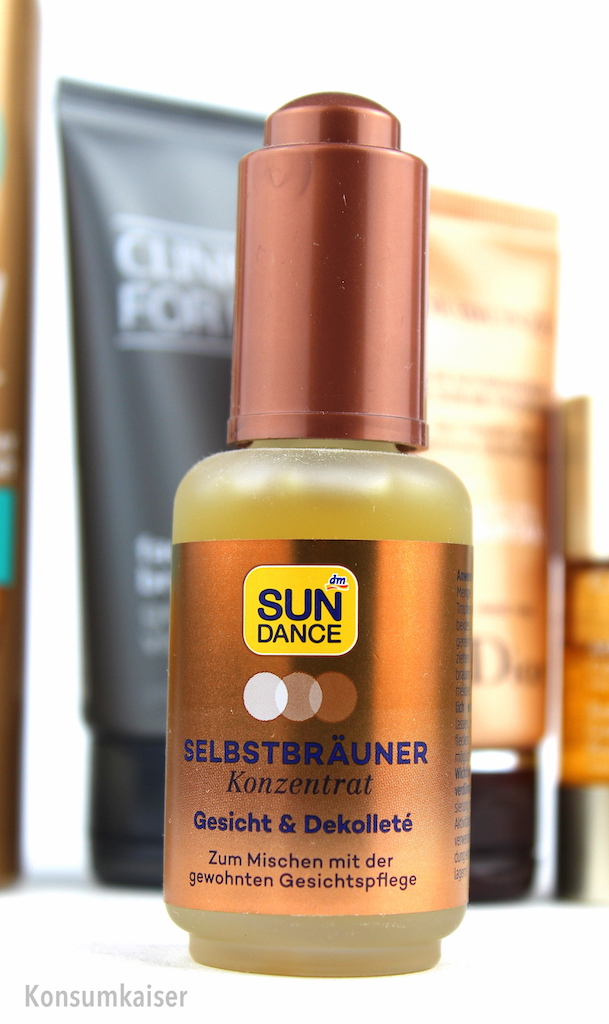 Sun Dance Selbstbräuner Konzentrat (30 ml, ca. € 4,95, bei DM) Dieses transparente Konzentrat wird genauso angewendet wie die Clarins Selbstbräunertropfen. Man könnte auch bei der Bräune denken, es handele sich um ein und dasselbe Produkt. Es gibt allerdings Unterschiede: Sun Dance färbt nur mit DHA, Clarins hat noch zusätzlich Erythrulose und Aloe Konzentrat an Bord. Ich persönlich kann allerdings keinen Unterschied ausmachen, auch die Haltbarkeit der Bräune ist bei mir nahezu identisch. Das ist auch der Grund, warum ich das Clarins Produkt nicht nachkaufen werde, denn Sun Dance macht den Job zumindest optisch genauso gut.