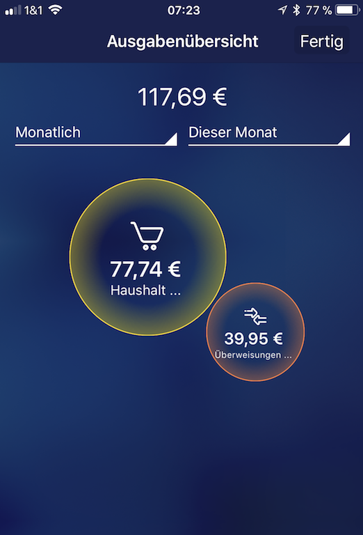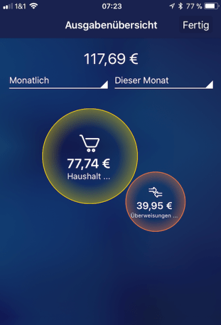 Nachteil: ich sehe in der App die Bereiche, in denen ich das Geld auflade, und kann auch eigene Hashtags vergeben, aber die krieg ich nicht zusammen im Kreisdiagramm angezeigt. Man kann zwar ein Foto dazu stellen, aber keine Notiz. Wie ist es bei dir? Da gibt es auf jeden Fall noch Update- Möglichkeiten.