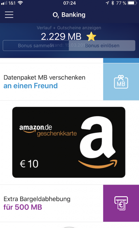 Für jeden Einkauf mit der Karte gibt es Bonus Datenvolumen in MB gutgeschrieben. Zu Beginn bekommt man ein „Willkommensgeschenk“ Das kann man dann, falls man O2 Mobilfunkkunde ist, für sich einstreichen, an eine/n Freund/in verschenken (muss auch O2 Mobilfunkkunde sein), oder pro 500 MB kann man zusätzlich (nach drei Mal kostenlos pro Monat) nochmals kostenfrei Geld am Automaten abheben. Es gibt auch die Möglichkeit die Bonus MB in einen Amazon Geschenkgutschein über € 10,00 umzuwandeln.